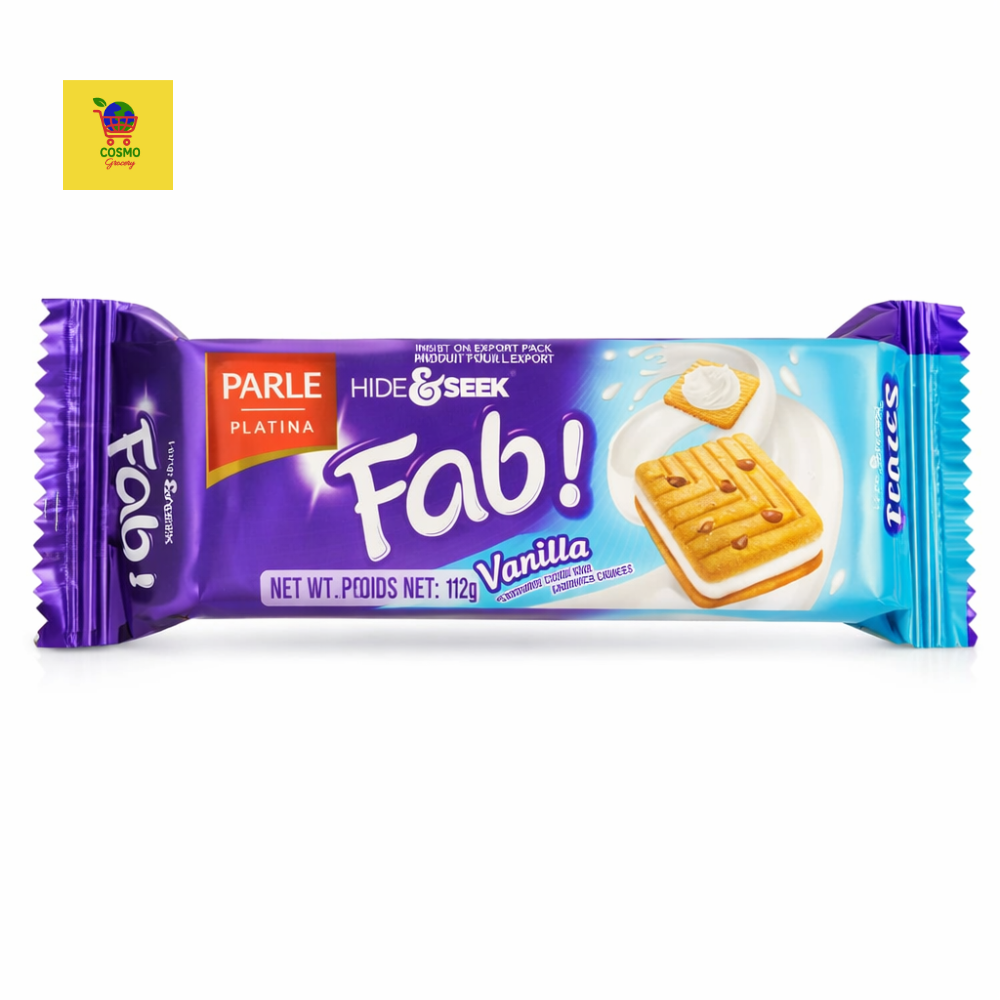 Indulge in the delicious taste of Parle Hide & Seek Fab Vanilla Cookies 112g, a perfect combination of crunchy chocolate biscuits and rich vanilla cream filling. These sandwich cookies offer a delightful balance of sweetness and crispiness, making them an ideal snack for all age groups.