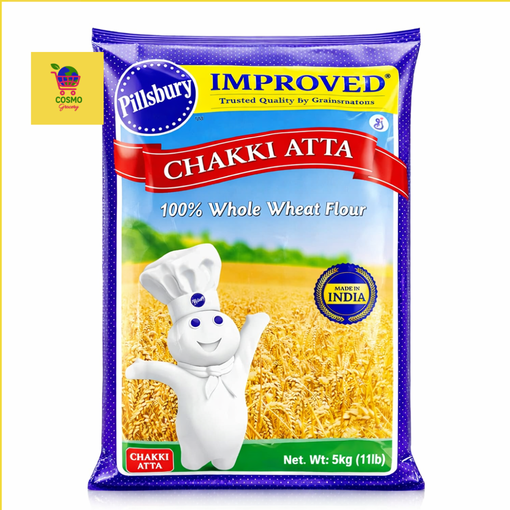 Cosmo Grocery offered Pillsbury Chakki Atta 100% Whole Wheat Flour 5kg is a premium quality wheat flour specially crafted for making soft, fluffy, and nutritious rotis every day. Now available at cosmogrocery this atta is trusted by households worldwide for its consistent texture, authentic taste, and superior quality.